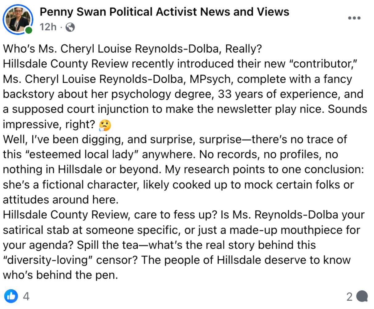“My research points to one conclusion: she’s a fictional character, likely cooked up to mock certain folks or attitudes around here.” Swan goes Negative on an esteemed local lady, Cheryl Louis Reynolds-Dolba.13